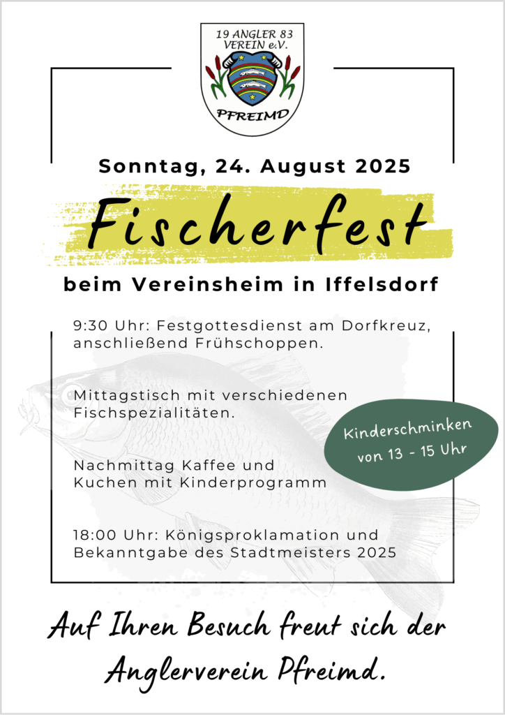 Startkartenausgabe: 05:15 – 05:30 am Vereinsheim in Iffelsdorf Fischen: 06:00 Uhr – 10:30 Uhr Abwiegen: 10:45 Uhr – 11:00 Uhr am Vereinsheim Frühschoppen: ab 10:00 Uhr im Vereinsheim